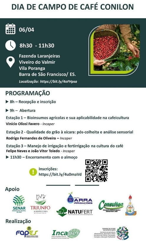 Além do conteúdo técnico, o evento também proporcionará uma experiência prática e sensorial. Os participantes poderão conhecer o processo de torra do café produzido na fazenda e degustar o Café Conilon Especial preparado na hora, vivenciando na prática o resultado de todo o processo produtivo. O Dia de Campo também busca fortalecer a valorização da cafeicultura local e incentivar o desenvolvimento do setor agrícola da região. O evento conta com o apoio da Prefeitura Municipal de Barra de São Francisco.
