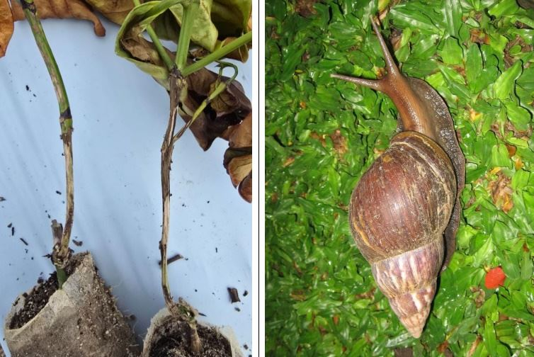 Sintomas de roletamento do caule em mudas e aspecto do caramujo gigante africano
