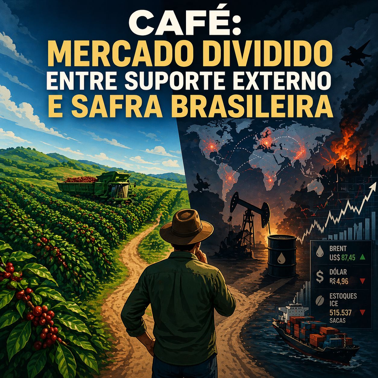 O mercado do café vive um momento de dualidade. Enquanto fatores externos sustentam as cotações, o avanço da safra brasileira impõe limites ao mercado interno.