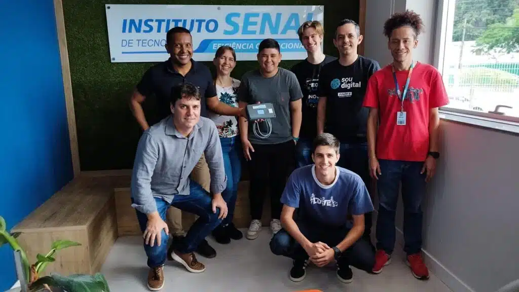 Professor Rafael de Queiroz Ferreira, Helder Knidel, Dayvson Silva, juntamente com as alunas de mestrado que participaram do projeto, e demais membros da equipe do Senai